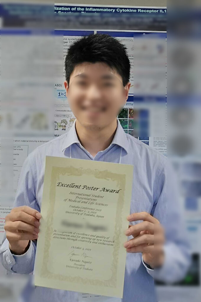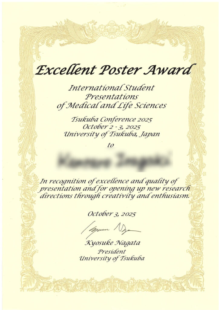 先日、つくば国際会議場で開催された筑波会議2025(Tsukuba Conference 2025)の「医学・生命科学国際学生発表会(International Student Presentations of Medical & Life Sciences)」において、医療科学類3年のIさんがExcellent Poster Awardを受賞しました。医療科学類の中間発表会のプレゼンテーションファイルからポスター作成まで、頑張りました。オーガナイザー・審査員の先生方、ありがとうございました!