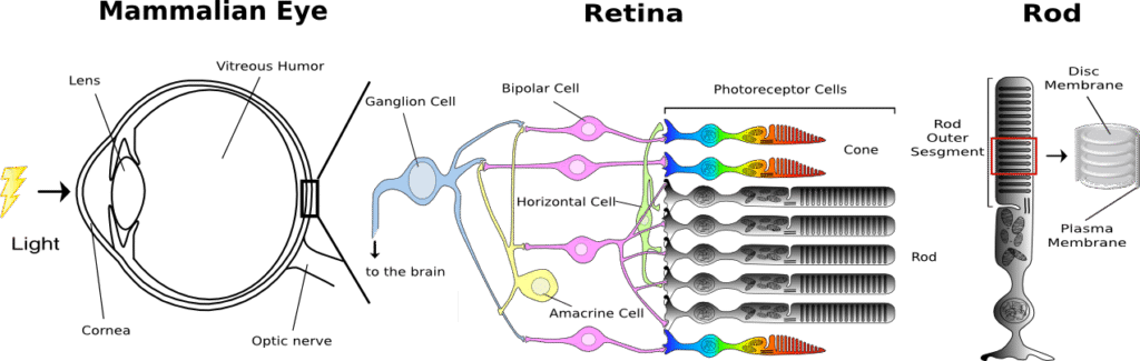 眼に入った光は、角膜、レンズ、ガラス体を通過し、視細胞に受容される。網膜中の視細胞は光が入射する方向と反対側にあり、そのため、光は視細胞に達するまでに神経節細胞や双極細胞などが含まれる神経層を通過することになる。 形態的に異なる2種類の視細胞、桿体(Rod)と錐体(Cone)があり、それぞれ、暗所、明所での視覚を分担している。 また、錐体には複数のサブタイプがあり、それぞれ、赤、緑、青の光を吸収しやすい視物質が含まれており、色識別を可能にしている。桿体にはロドプシンが大量に含まれる円盤膜がパンケーキ状に重なっている。