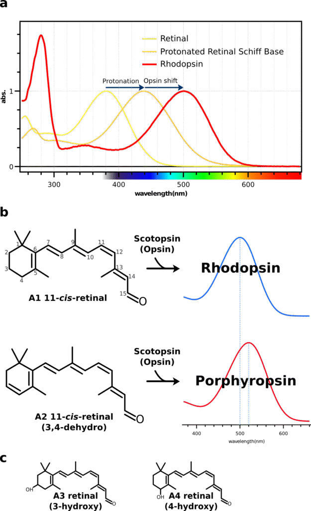b:ロドプシンにはA1、A2の2種類のレチナールが知られている。A2レチナールより構成するものを特にポルフィロプシンとよび、A1レチナールよりも共役二重結合系が長いのでより長波長の光を吸収することができる。