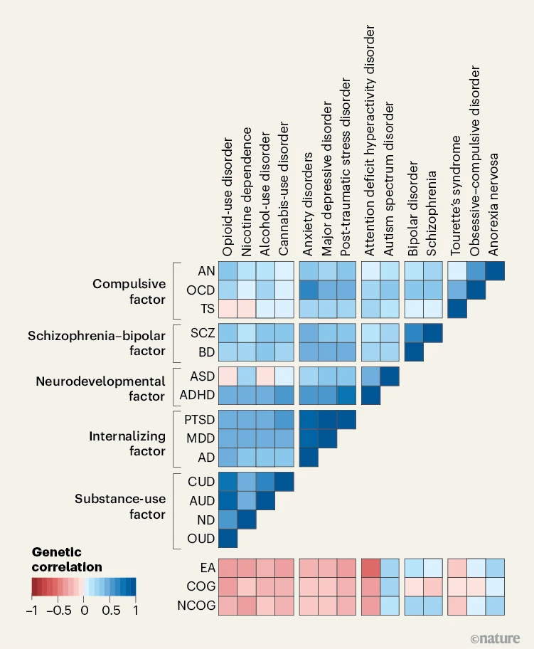 ここで重要なのは「単一診断に固有の遺伝変異は少ない」という含意で、DSM分類は臨床的には役立つが、生物学的にはかなり恣意的に見える可能性がある、という問題提起につながります。図(Fig.1)にこの結論を視覚化しており、14疾患(AN, OCD, TS, SCZ, BD, ASD, ADHD, PTSD, MDD, AD, CUD, AUD, ND, OUD)の遺伝相関を並べ、相関が高いほど同じリスク変異を多く共有すること、そしてその相関構造から5つのゲノム因子にまとまることを示しています。また図の凡例では、精神疾患リスクの遺伝シグナルは常に「他の形質に対してマイナス」ではなく、教育達成(EA)、認知能力(COG)、さらにEAに寄与する非認知的スキル(NCOG:動機づけや創造性など)とも多様な相関を示し得ることが明示され、精神疾患に関連する遺伝変異が“価値ある神経多様性(neurodiversity)の源泉”にもなり得る、という視点が提示されています。