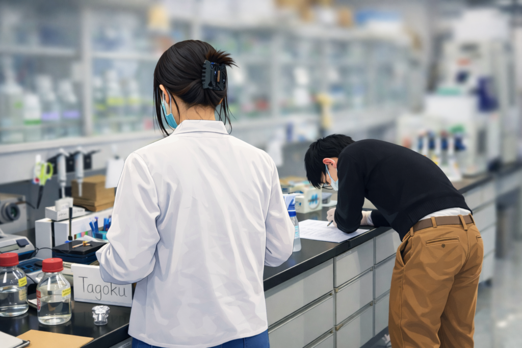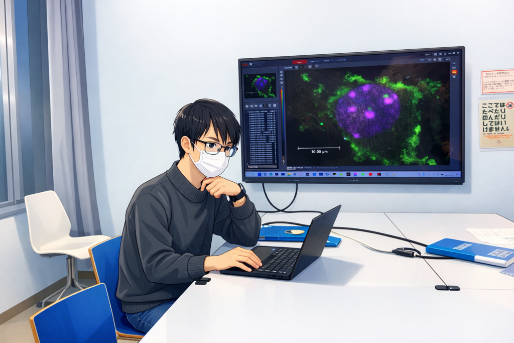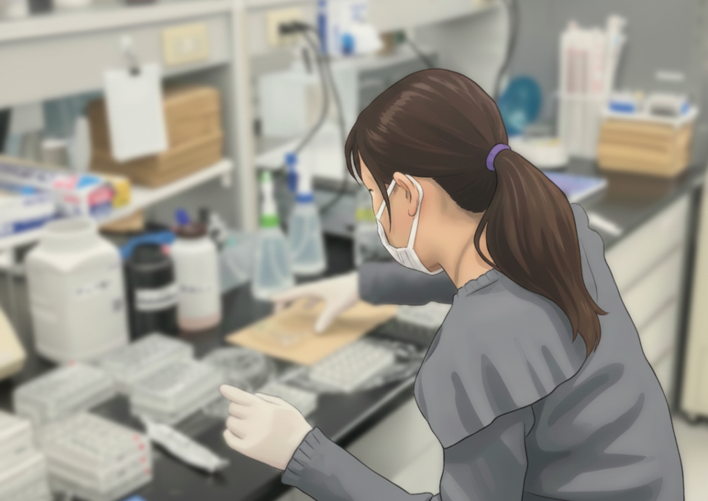 本日は、朝から学生と研究について議論し、その後標本を観察したり成績チェックや諸々の書類を片付けました。研究室内では、学生同士で実験を教えあい、定量化したデータについて議論する様子が見られました。