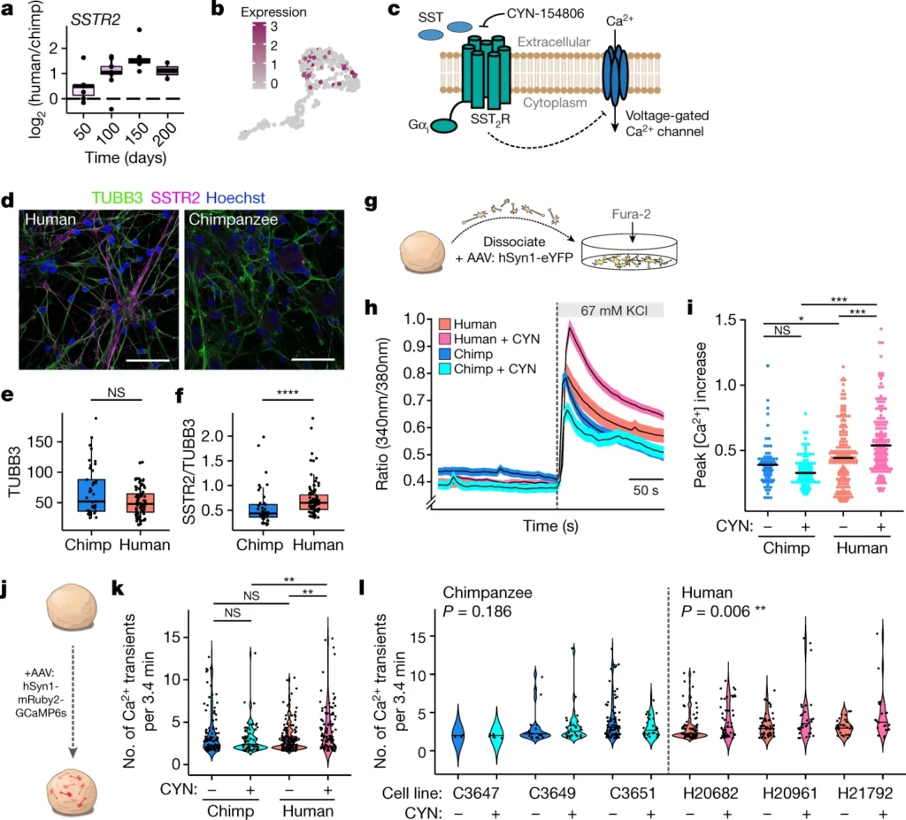 霊長類の中でもヒトは独特な発生過程を示す。これがヒトに特異的な多くの形質の原因となっている。しかし、霊長類であるヒトやチンパンジーの初代組織を利用することができないため、ヒト進化を研究する方法は限られている。霊長類由来の誘導性多能性幹細胞を用いたin vitroでの比較手法により、細胞レベル・分子レベルで、種間の違いが明らかにされ始めている。特に、脳オルガノイドは、霊長類の神経発生をin vitroで研究するための有望なプラットフォームとして有望視されている。しかし、オルガノイドの種間の比較は、発生のタイミングや分化にばらつきがあるために複雑である。本論文の著者らは、これらの制約に対応するために、ヒトとチンパンジーの誘導多能性幹細胞を融合させて、4倍体ハイブリッド幹細胞を作製することによって、新たな研究手法を開発した。著者らはこの方法を用いて、これらのハイブリッド幹細胞を神経オルガノイドに分化させ、大脳皮質発生における種間の違いについて調べた。その結果、ハイブリッドオルガノイドは、異なる細胞タイプと発生段階にわたってシス作用性とトランス作用性の遺伝子発現の違いを解き明かすための制御系となることが分かり、アストロサイト関連遺伝子に対する選択的痕跡が明らかになった。著者らはさらに、ニューロンのカルシウムシグナル伝達を調節し、神経精神障害と関連付けられている、ヒトソマトスタチン受容体2型遺伝子(SSTR2)の発現が上昇していることを見いだした。著者らは、大脳皮質ニューロンにおいてSSTR機能調節に対するヒト特異的な反応を明らかにしており、これは、このプラットフォームがヒト進化の分子基盤の解明に役立つ可能性を明確に示している。