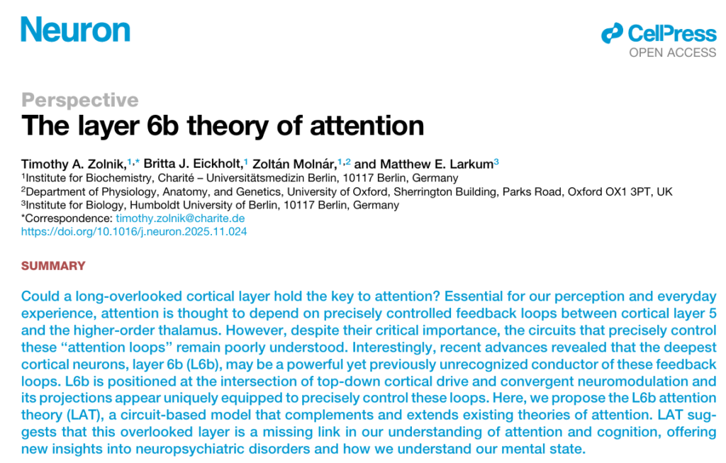 長年見過ごされてきた皮質層が注意の鍵を握るのか?知覚や日常体験に不可欠な注意機能は、大脳皮質第5層と高次視床との精密に制御されたフィードバックループに依存すると考えられている。しかし、その重要性にもかかわらず、これらの「注意ループ」を精密に制御する回路は未だ十分に解明されていない。興味深いことに、最近の進展により、最も深層にある皮質6b層(L6b)が、これまで認識されていなかった強力なフィードバックループの伝導体である可能性が明らかになった。L6bはトップダウンの皮質駆動と収束性神経調節の交差点に位置し、その投射はこれらのループを精密に制御するために特化した構造を有しているように見える。本稿では、既存の注意理論を補完・拡張する回路ベースモデルとして「L6b注意理論(LAT)」を提唱する。LATは、この見過ごされてきた層が注意と認知の理解における欠落リンクであり、神経精神疾患や自己の精神状態の理解に関する新たな知見を提供すると示唆する。