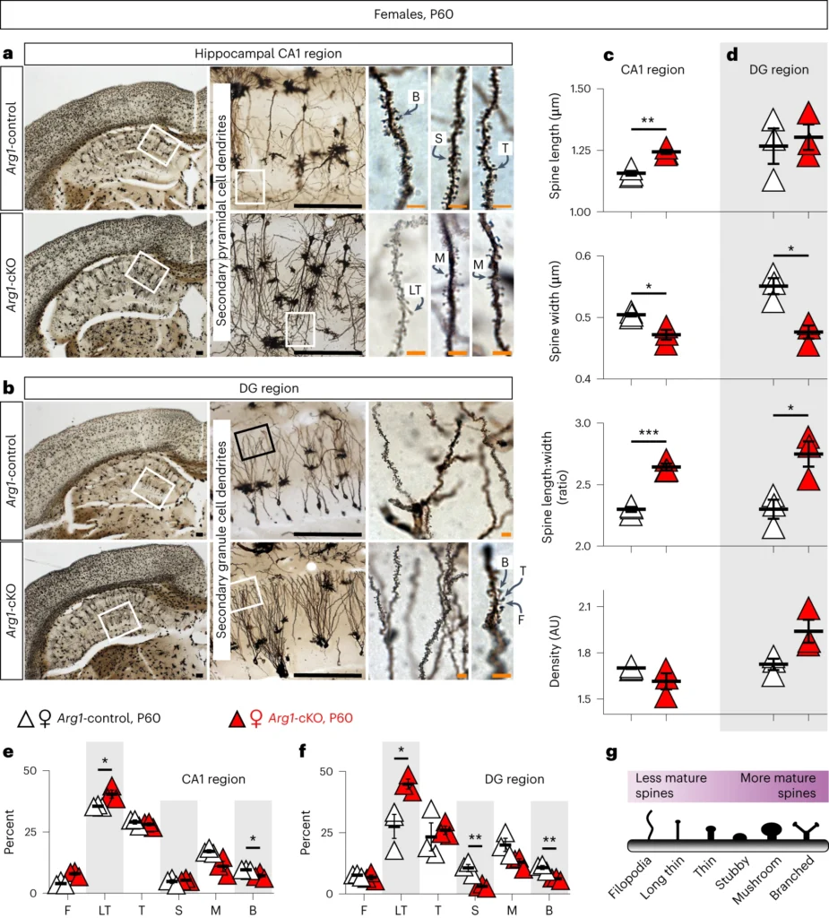 Figure 7は,Arg1をミクログリア特異的に欠失させることで,雌マウス海馬CA1および歯状回の両方において,樹状突起スパインが成熟型から未熟型へとシフトすることを明確に示している。