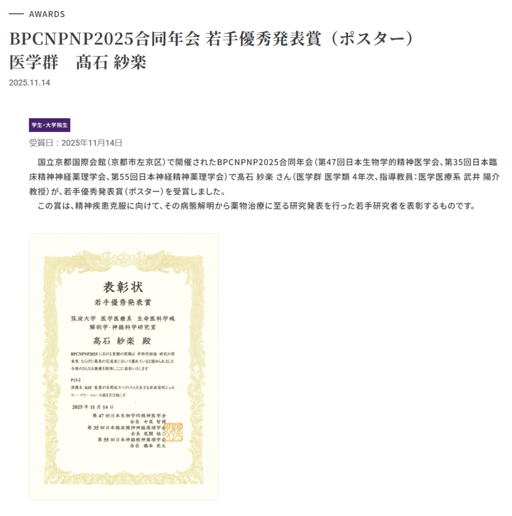 BPCNPNP2025合同年会 で若手優秀発表賞(ポスター)を受賞した医学類M4のTさんが、筑波大学ウェブサイトに取り上げられました。おめでとうございます!
