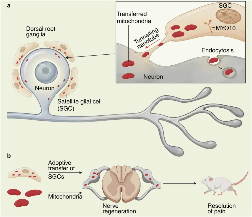 近年、細胞間ミトコンドリア移送(mitochondrial transfer)が報告されているが、in vivoでの証拠は限定的だった。本研究は、末梢神経節(DRG)の衛星グリア細胞(Satellite glial cells: SGCs)が感覚ニューロンへミトコンドリアを移送することを発見し、この移送が末梢神経障害や神経障害性疼痛からニューロンを保護することを示した。SGCsはtunnelling nanotubes (TNTs) を形成し、MYO10依存的にミトコンドリアをニューロンへ供給する。ミトコンドリア移送を阻害すると神経変性と疼痛が生じた。さらにヒトDRGでも同様の構造と機構が存在し、糖尿病患者ではMYO10発現とミトコンドリア移送が低下していた。健康なヒトSGCsまたはミトコンドリアをマウスDRGへ移植すると、神経障害性疼痛が改善した。