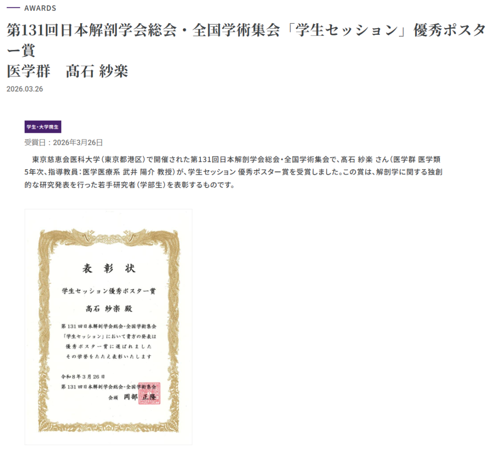 筑波大学ウェブサイトに掲載されました 2026年4月16日2026年4月16日 takeilab 第131回日本解剖学会総会・全国学術集会で、学生セッション 優秀ポスター賞を受賞した医学類M5のTさんが、筑波大学ウェブサイトに取り上げられました。おめでとうございます! 優秀ポスター賞を受賞しました FacebookXBlueskyCopy