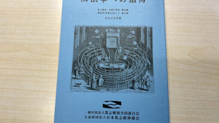 2025年度「解剖学への招待」(篤志解剖全国連合会・日本篤志献体協会)が刊行されました。「私と献体 会員の手記第45集」や「解剖学実習を終えて第47集」が収められています。本学からは、医学類M2のKさんとNさんの「解剖学 続きを読む